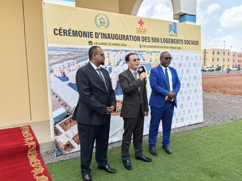 2026年3月23日,驻吉布提大使胡斌陪同吉总统盖莱出席由我援建的500套社会保障房项目揭幕仪式并现场接受媒体采访,吉总理、议长、城建部长及其他政要等参加活动。