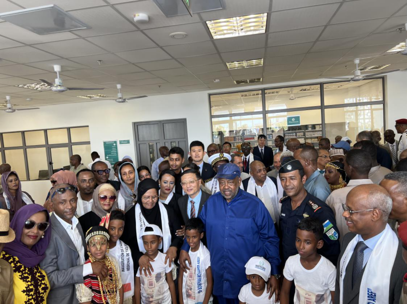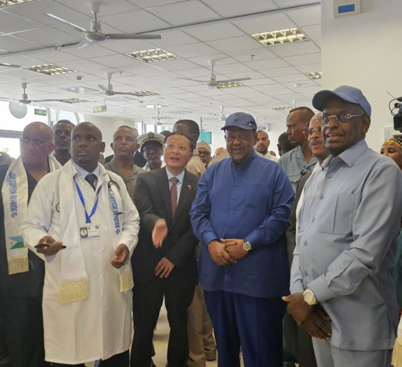 2024年12月15日,驻吉布提大使胡斌陪同吉总统盖莱出席我援建的塔朱拉医院项目揭幕仪式,吉总理、议长、卫生部长及塔朱拉州负责人等共同出席。